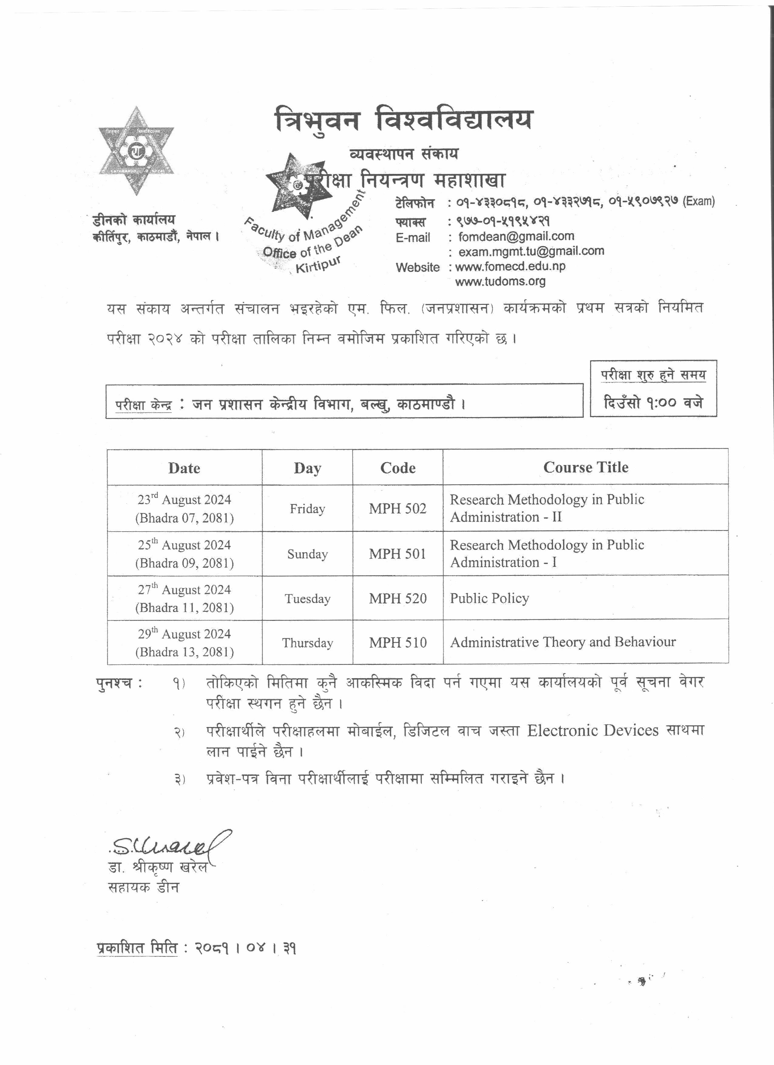 एमफिल (२०२४) १३ औ ब्याच प्रथम सत्रको परिक्षा तालिका
